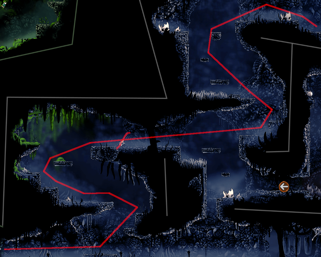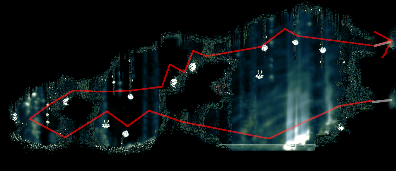 On the first main room, I just follow the path with some pogo, the exact timing allowing me to skip over the few enemies wandering. If it’s off, just take time to properly avoid touching them but overall is a thoughtless room to go through. I will kill the grub while taking the path under as it feels faster than going above and less risky compared to doing an angel fall above enemies.