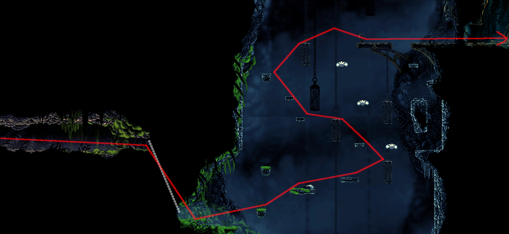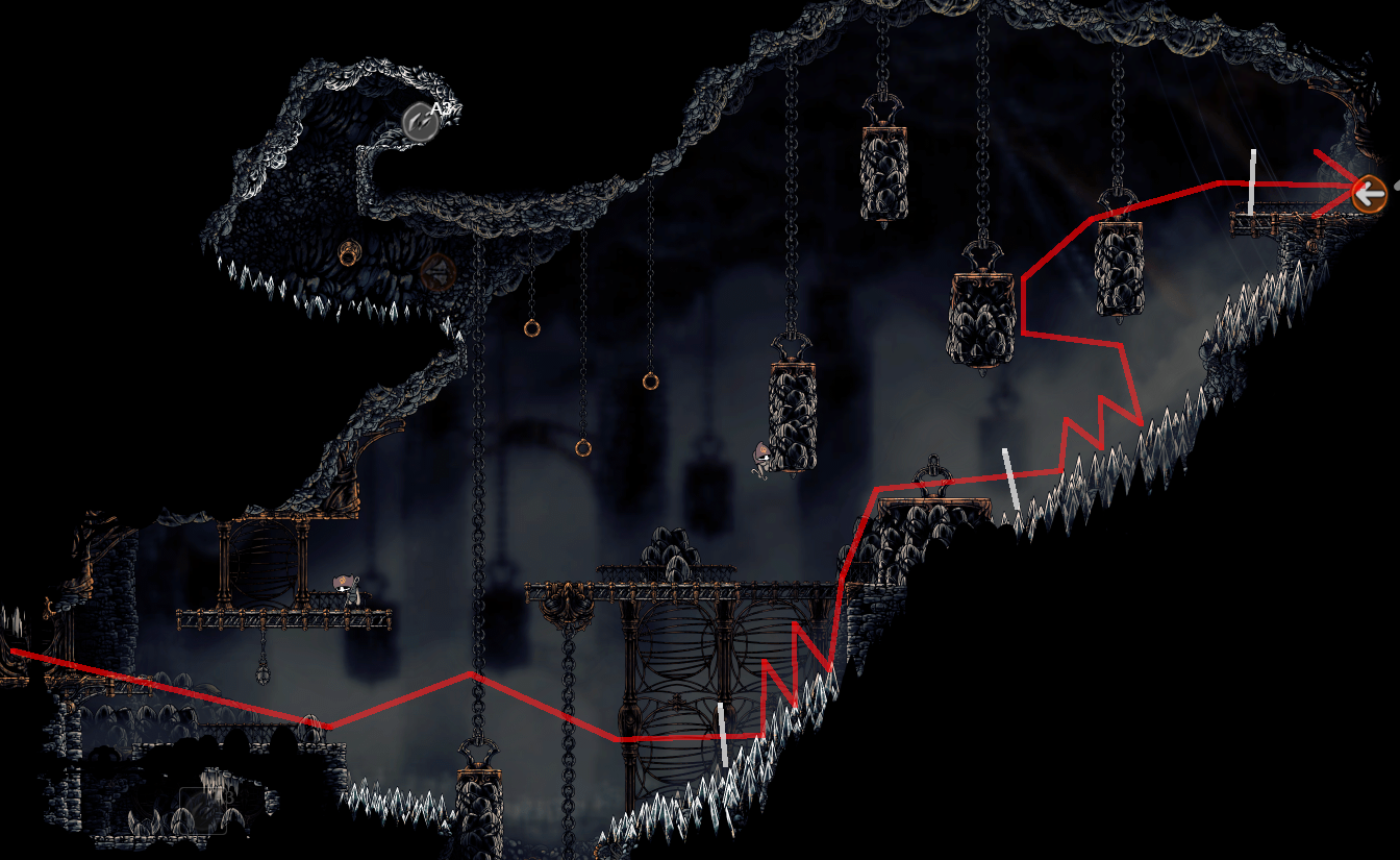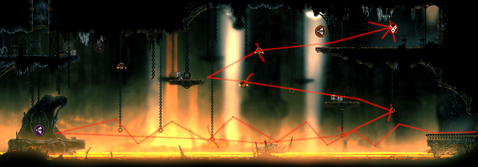 Here comes a difficult… wait, I’m getting news, apparently this is an easy room? Yeah, thanks to the reaper secret technique, we can skip most of the danger, make use of the reaper lunge! Start by doing a long jump and pogo on the second cross to reach the first cage. Then wait until the cross stops near you to jump and dash, pogo on it then dash and reach the second cage. Finally the supposedly hardest part, wait until the cross is far to jump and dash, then pogo in the air (you have to miss) and lunge(dash again) to cross the whole distance safely.