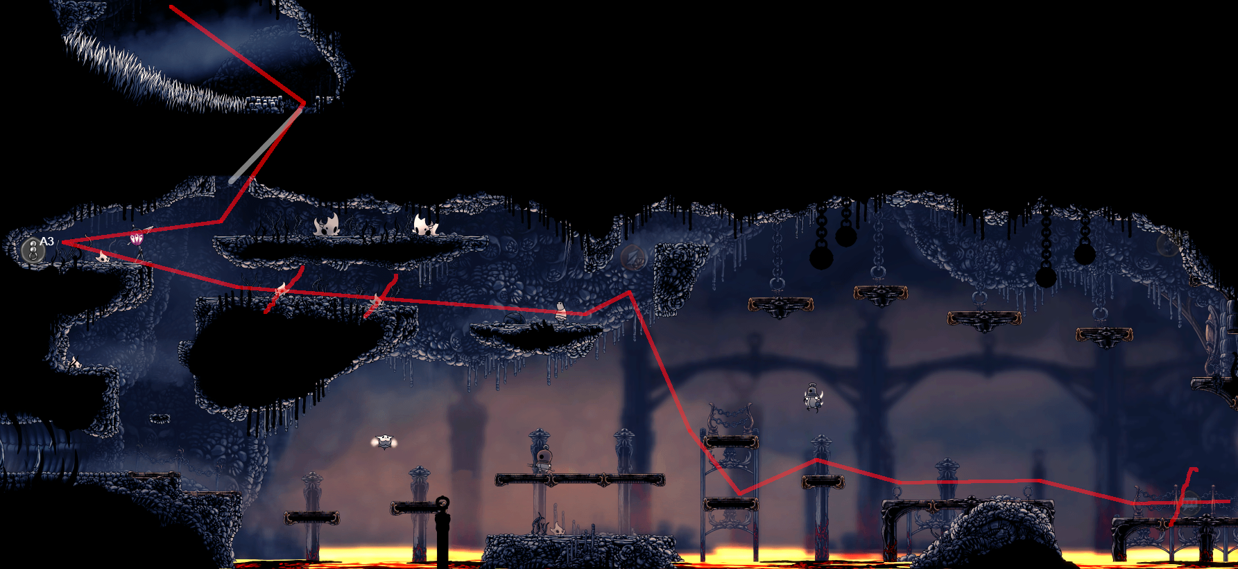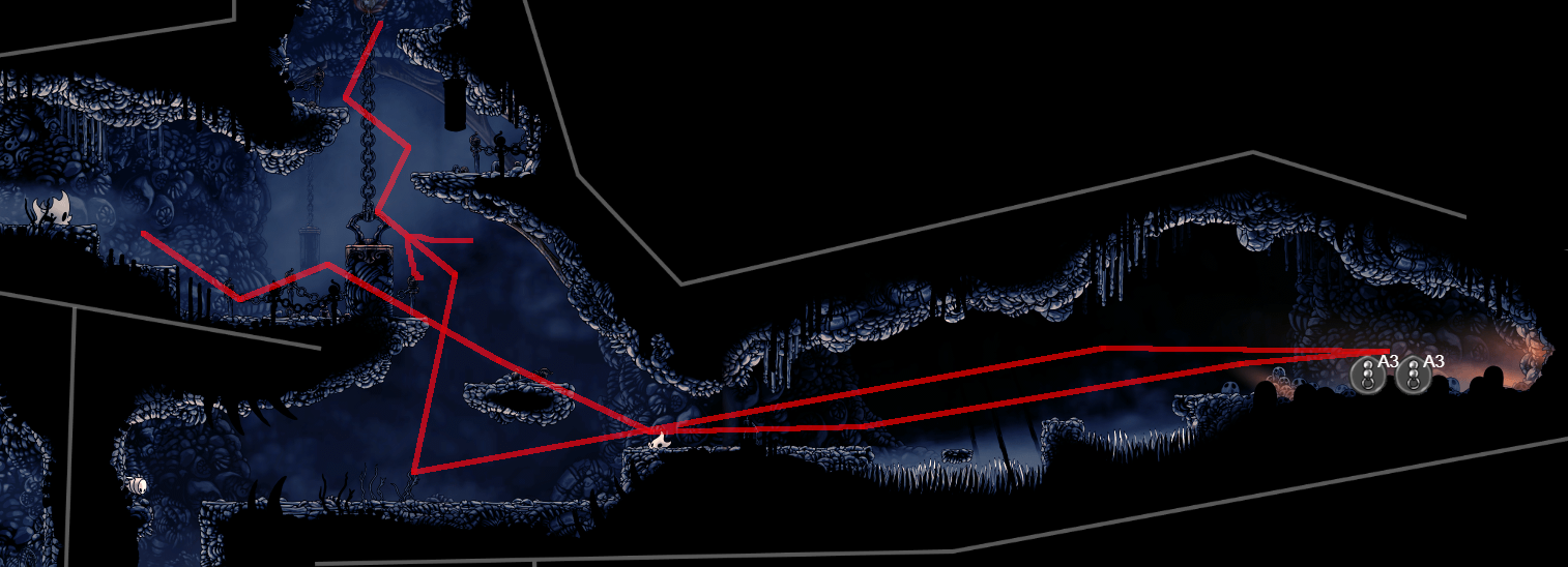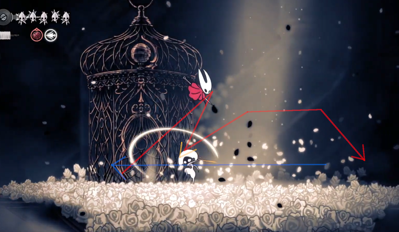 Here comes a difficult… wait, I’m getting news, apparently this is an easy room? Yeah, thanks to the reaper secret technique, we can skip most of the danger, make use of the reaper lunge! Start by doing a long jump and pogo on the second cross to reach the first cage. Then wait until the cross stops near you to jump and dash, pogo on it then dash and reach the second cage. Finally the supposedly hardest part, wait until the cross is far to jump and dash, then pogo in the air (you have to miss) and lunge(dash again) to cross the whole distance safely.