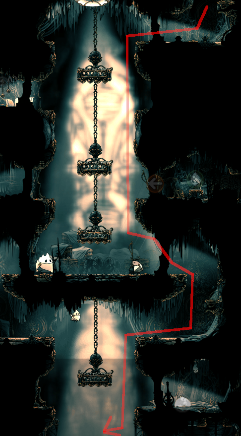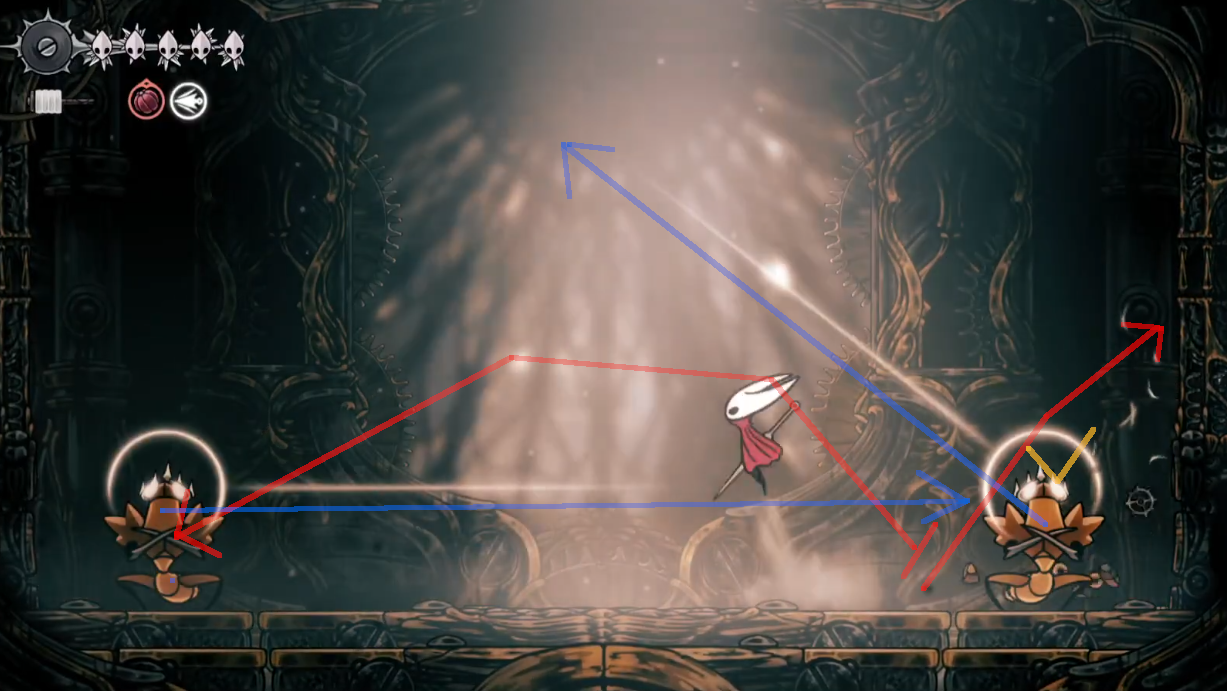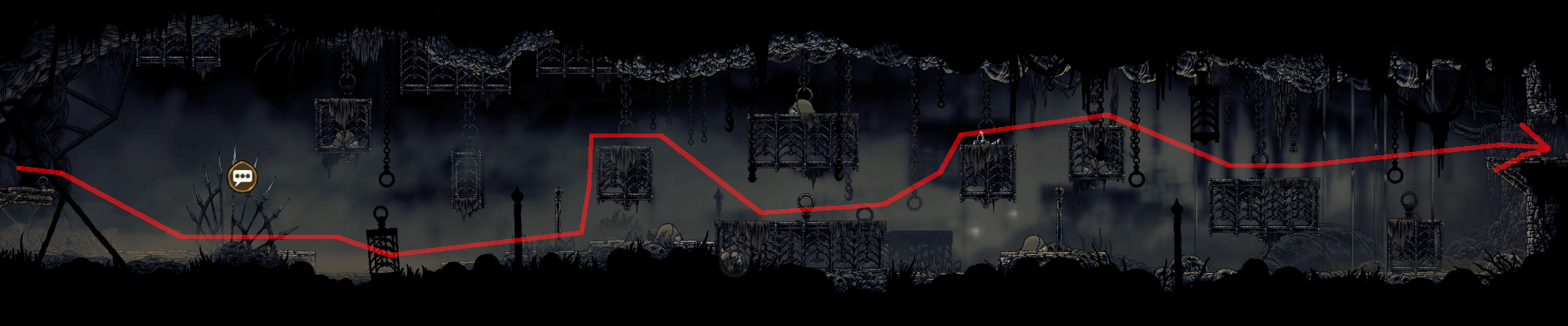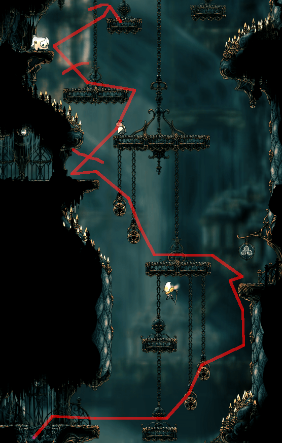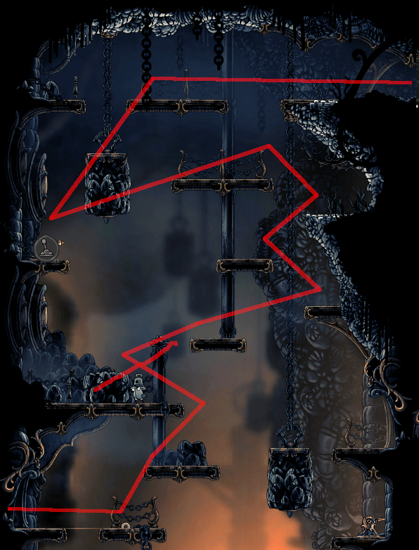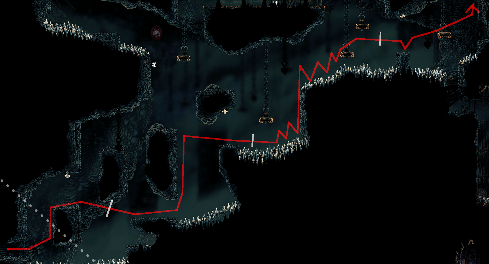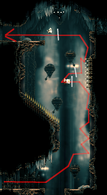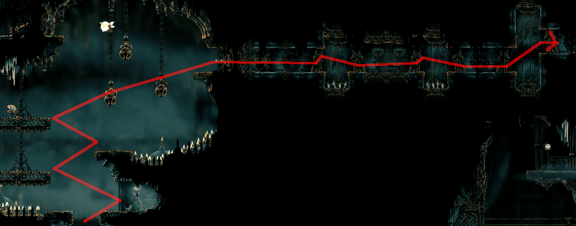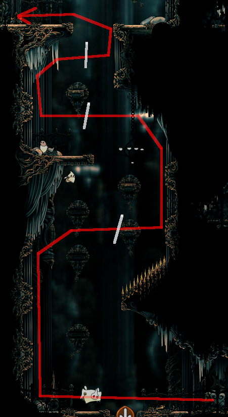 Jump dash above the silk gatherer and climb the tower, wait a bit and pogo on the spinning spikes, enter left. Wavedash to the end of the path and enter left to the reaper chapel. Safely climb to the left, wait a bit and pogo to the arena.