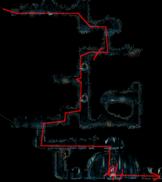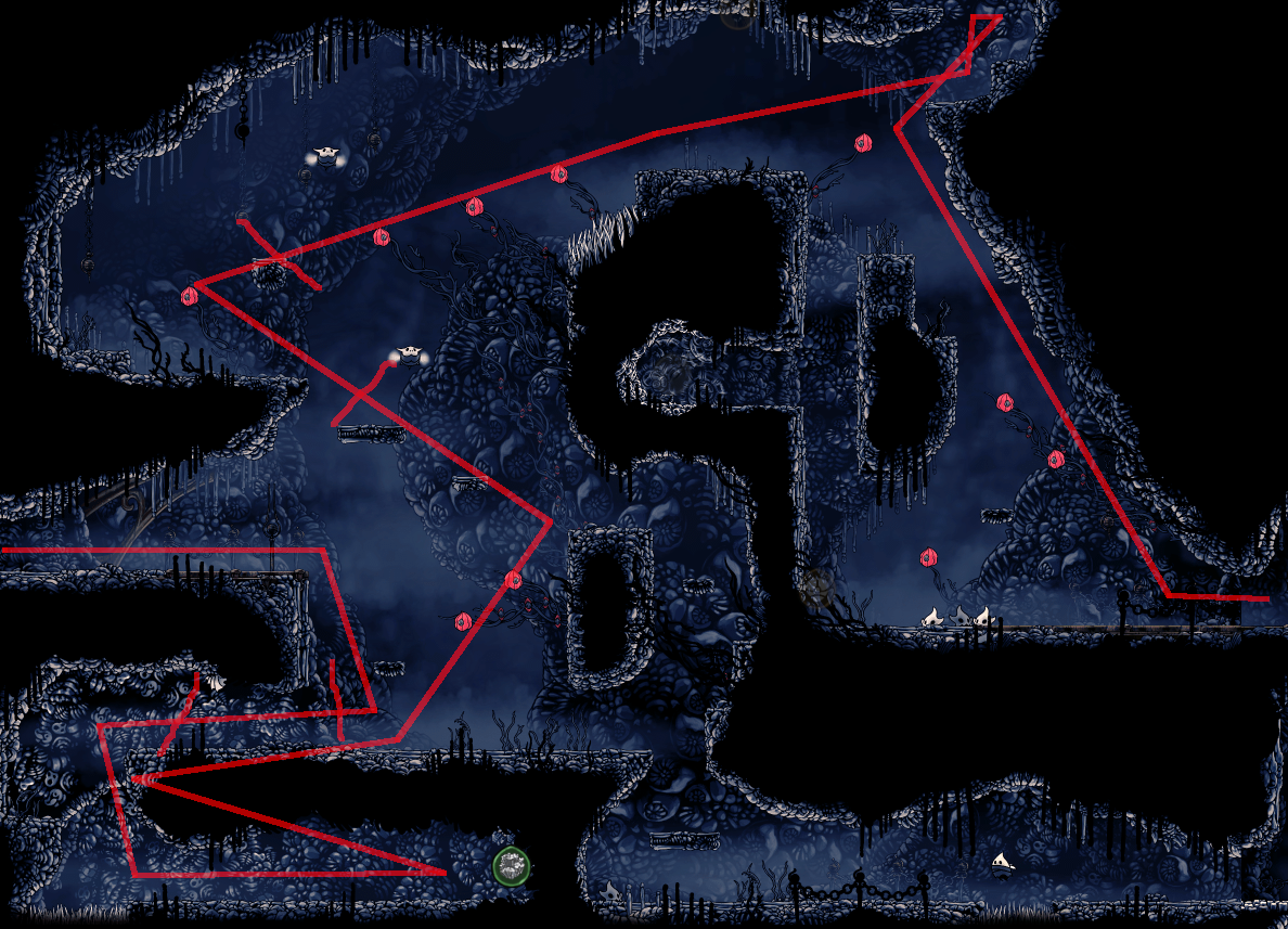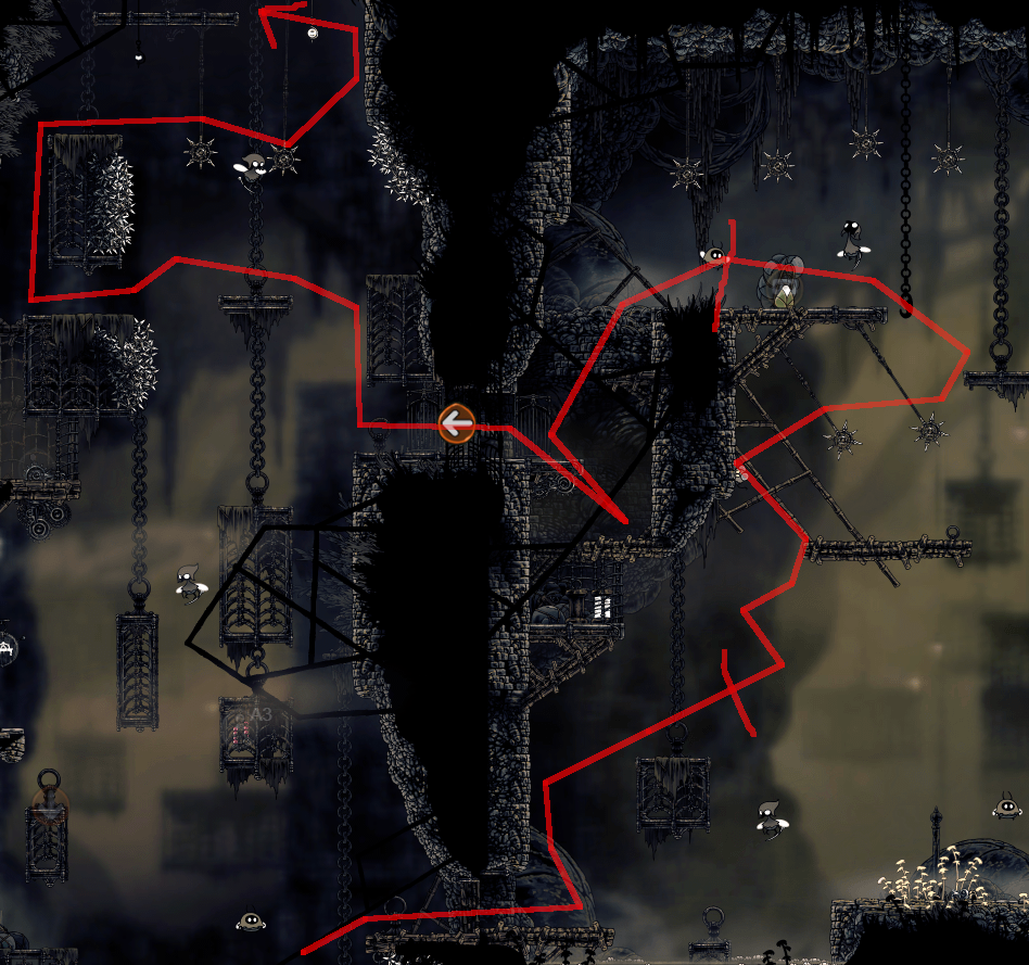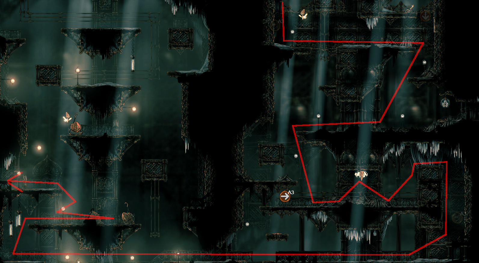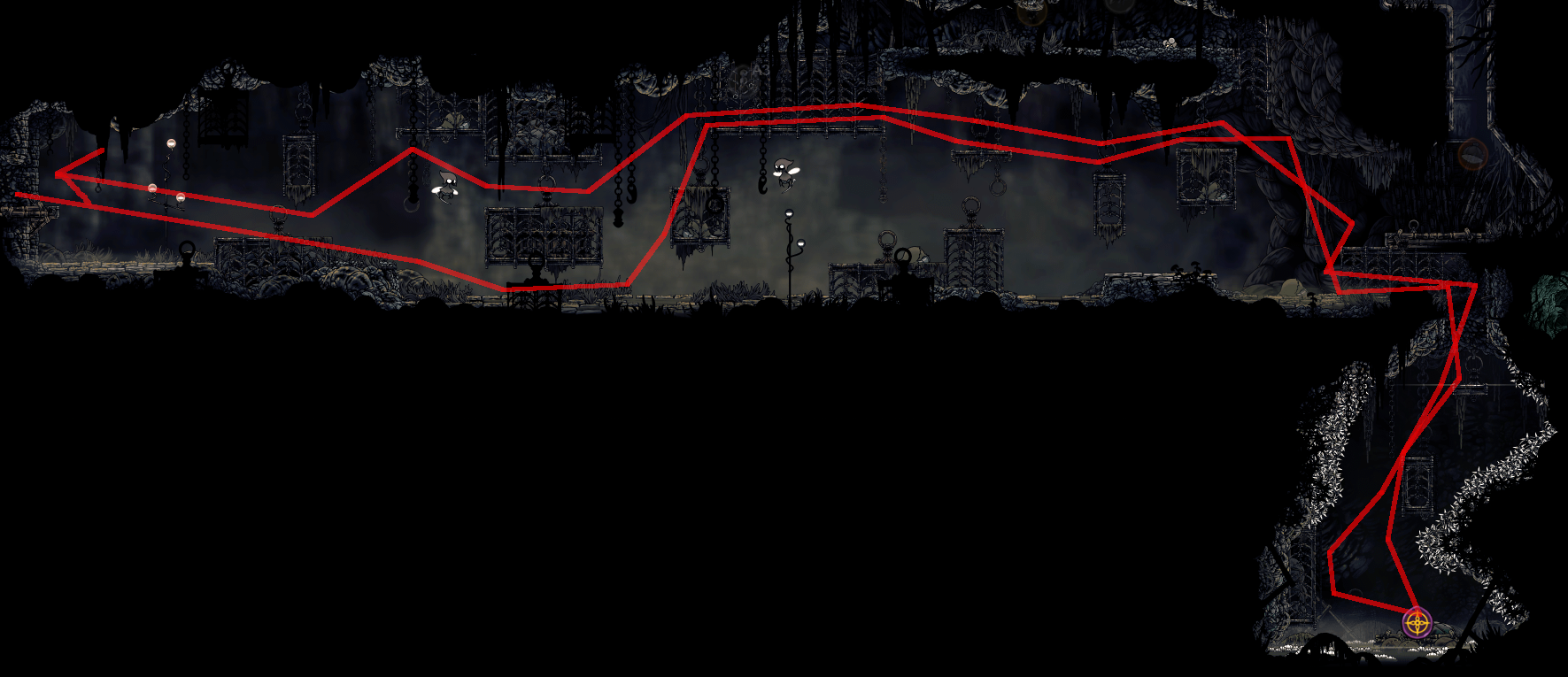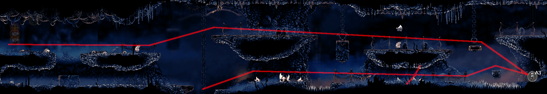 Jump dash above the silk gatherer and climb the tower, wait a bit and pogo on the spinning spikes, enter left. Wavedash to the end of the path and enter left to the reaper chapel. Safely climb to the left, wait a bit and pogo to the arena.