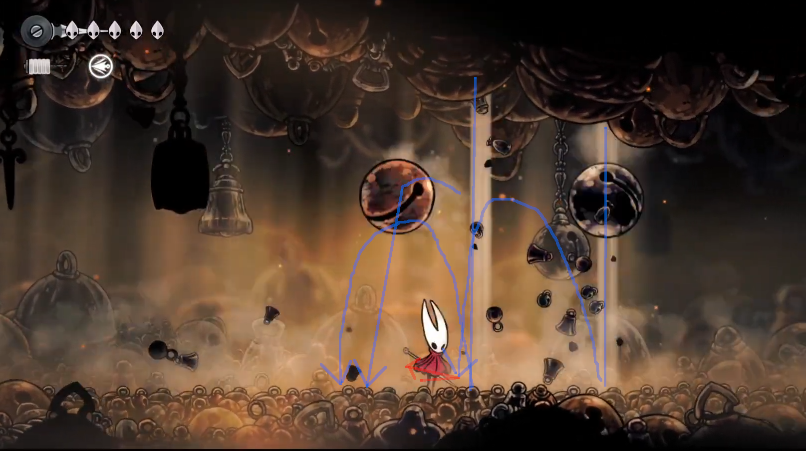 Diagonal bells: Be most careful of the trajectories, always stay in the middle of the room and either bounce the second bell, or jump dash above it. A simpler way is to make sure the first won’t hit you then throw a spear to punish and block the second bell at once.