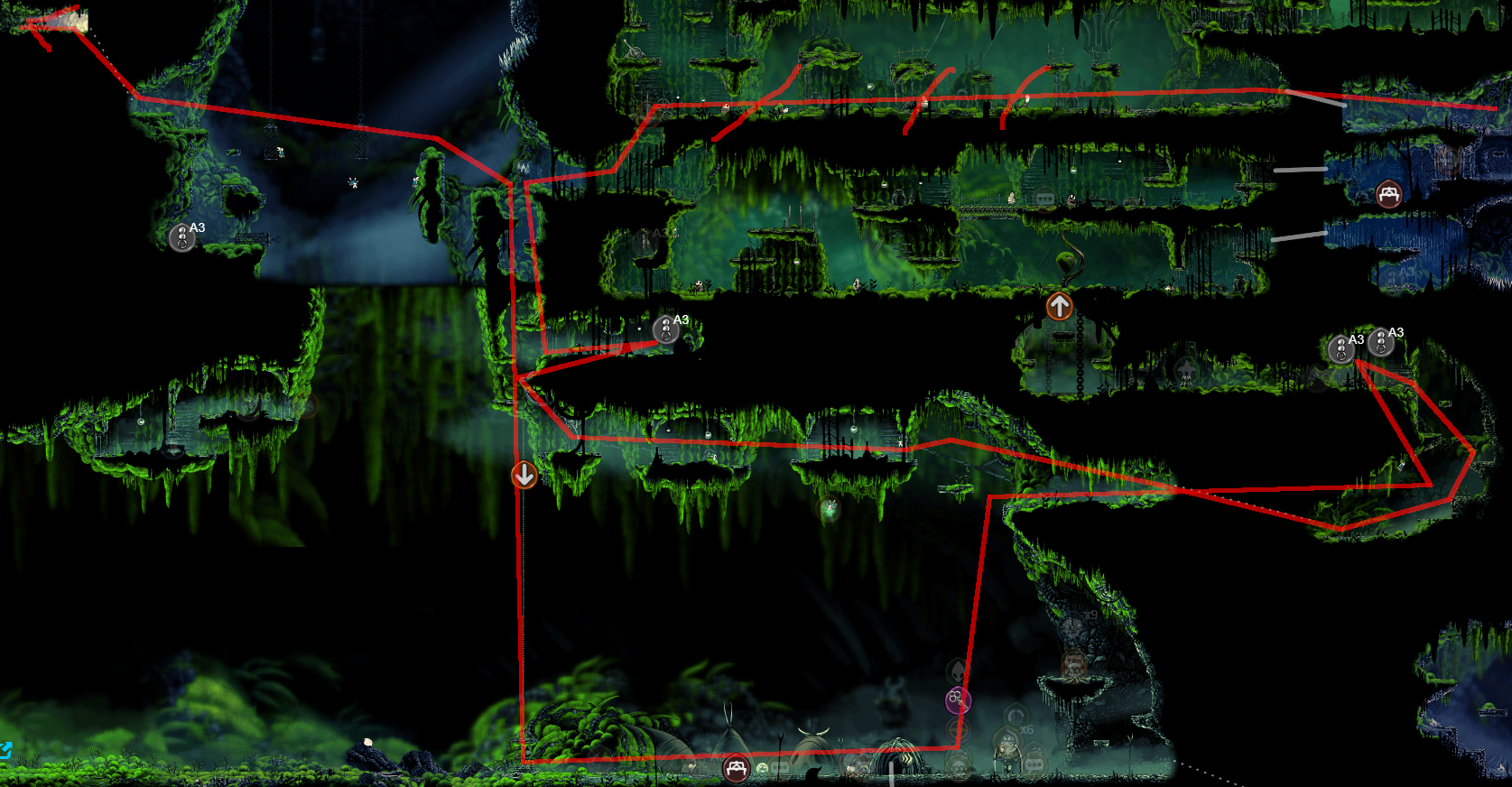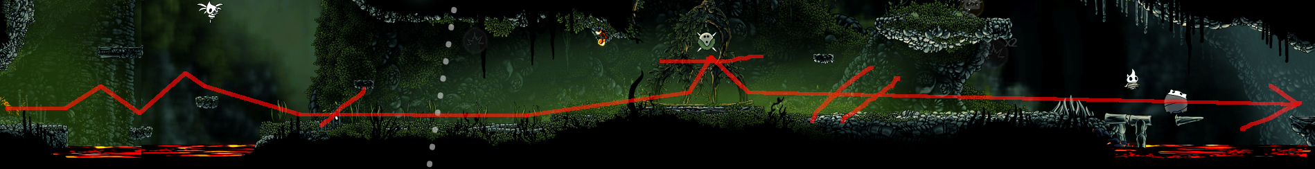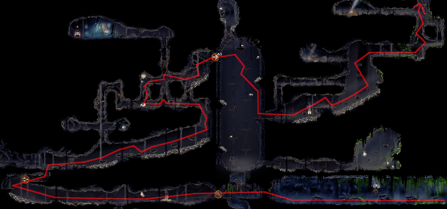 Let yourself fall and hit the flying ant once before throwing a spear to kill it and open the wall. Kite the second flying ant twice (if you follow the steps you’ll be missing 2 silk then) and throw a spear to safely grab the rosary string. Let yourself fall and pogo to skip the platforming near the flying ant and reach the Dash upgrade. Now that you have it, you can destroy your fingers by wavedashing at every flat ground opportunity. When leaving throw a spear and finish the bell worker with a dash strike. Go down to the fast travel, break the wall to quickly skip the animation, taunt to call the beast early and leave for Mosshome. Use your stashed rosary strings in advance to gain some time.