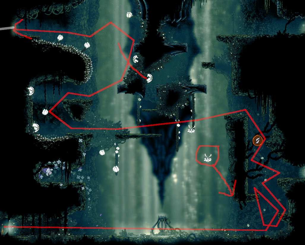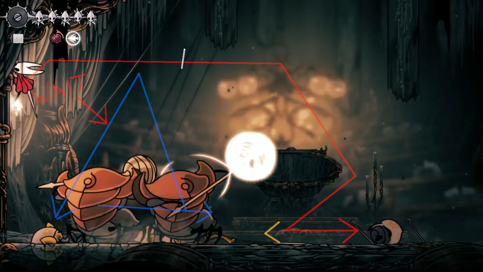 Go up and enter the room of doom, except we have a secret technique to skip most of it. Climb then pogo on the wretch, if it keeps floating up(if it doesn’t, you could risk it by going right, or reset the room), pogo 5 times to reach the platform, wait until the mite jumps then proceed. Quickly hit the bolas wretch then spear it(if it’s high enough, run under and leave), if you’re too slow you expose yourself to pain. In the worst case, make use of the reaper windshield(regular attack) for protection. Do the regular path like a stroll so you don’t aggro the enemy.