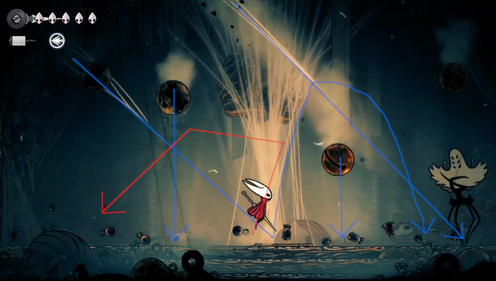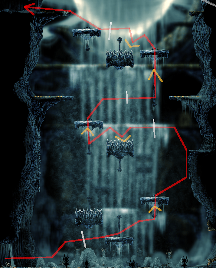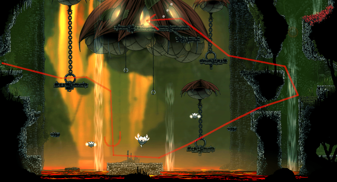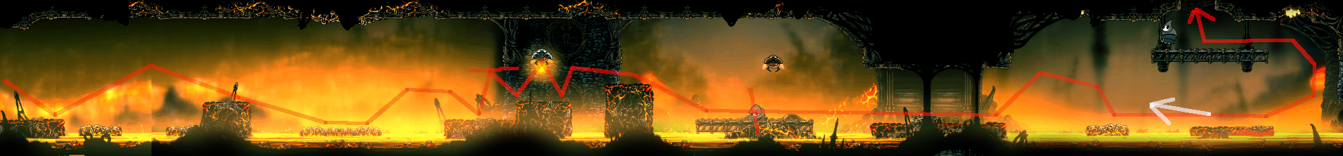 In the second water room, hook the ring, run under the maestro and hook more rings, when you reach the ambush platform, pogo on the enemy and hook away. Then just floatfall the regular path, the spikes room is not worth mention if you don’t try anything special. Just make sure to sit at the bench, to repair your pimpillos, and set spawn, then enter the ultimate challenge…
