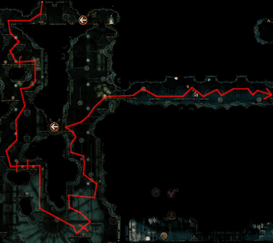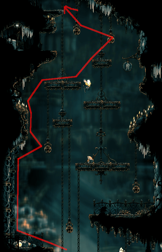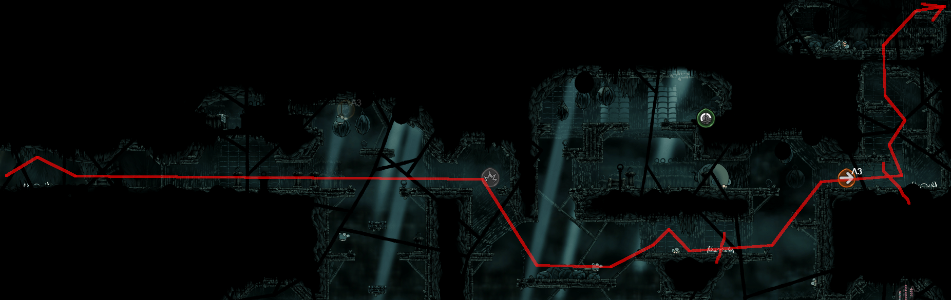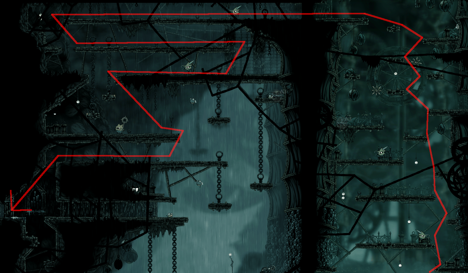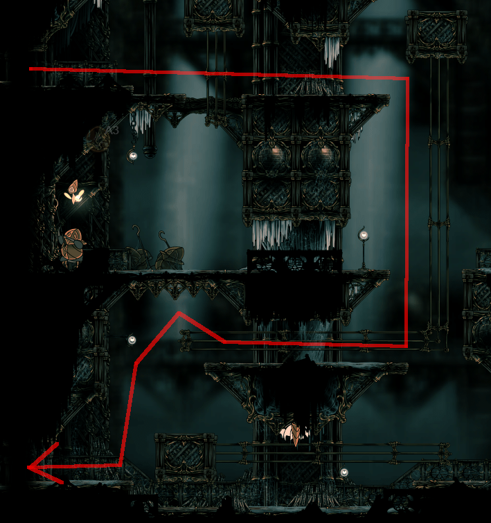 Jump down the elevator shaft and float then hook right to enter the large room. Climb, pass under the spider then hook, climb, pass under the spider and hook again, pogo twice, climb and pogo until the platform. Hook and quickly jump to the platform to escape the spider and leave. The rest is basic platforming I won’t describe, Phantom is defeated so there is near no danger here.