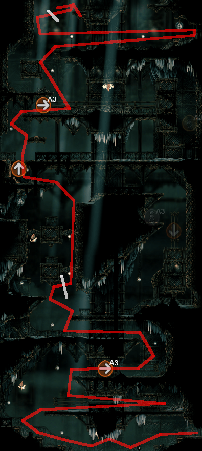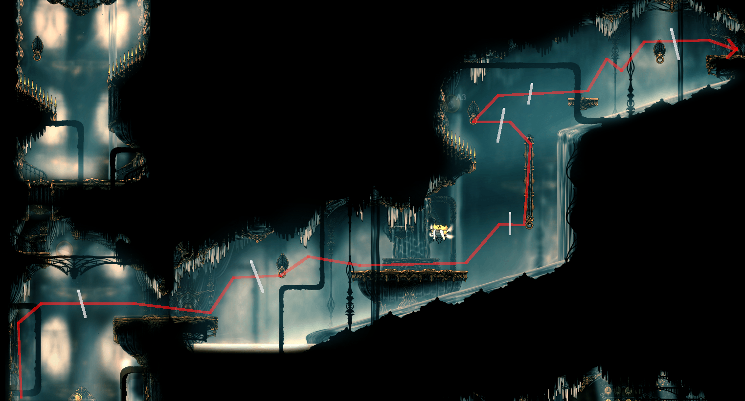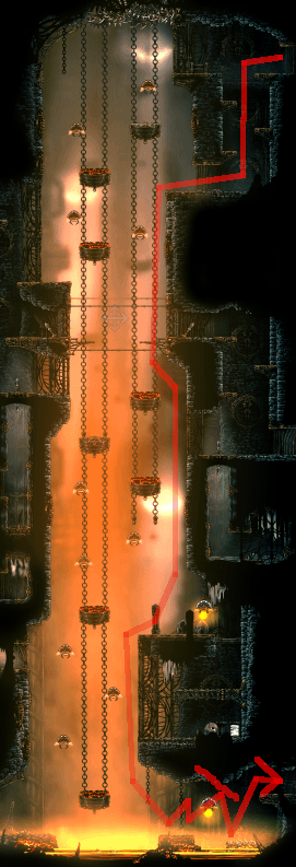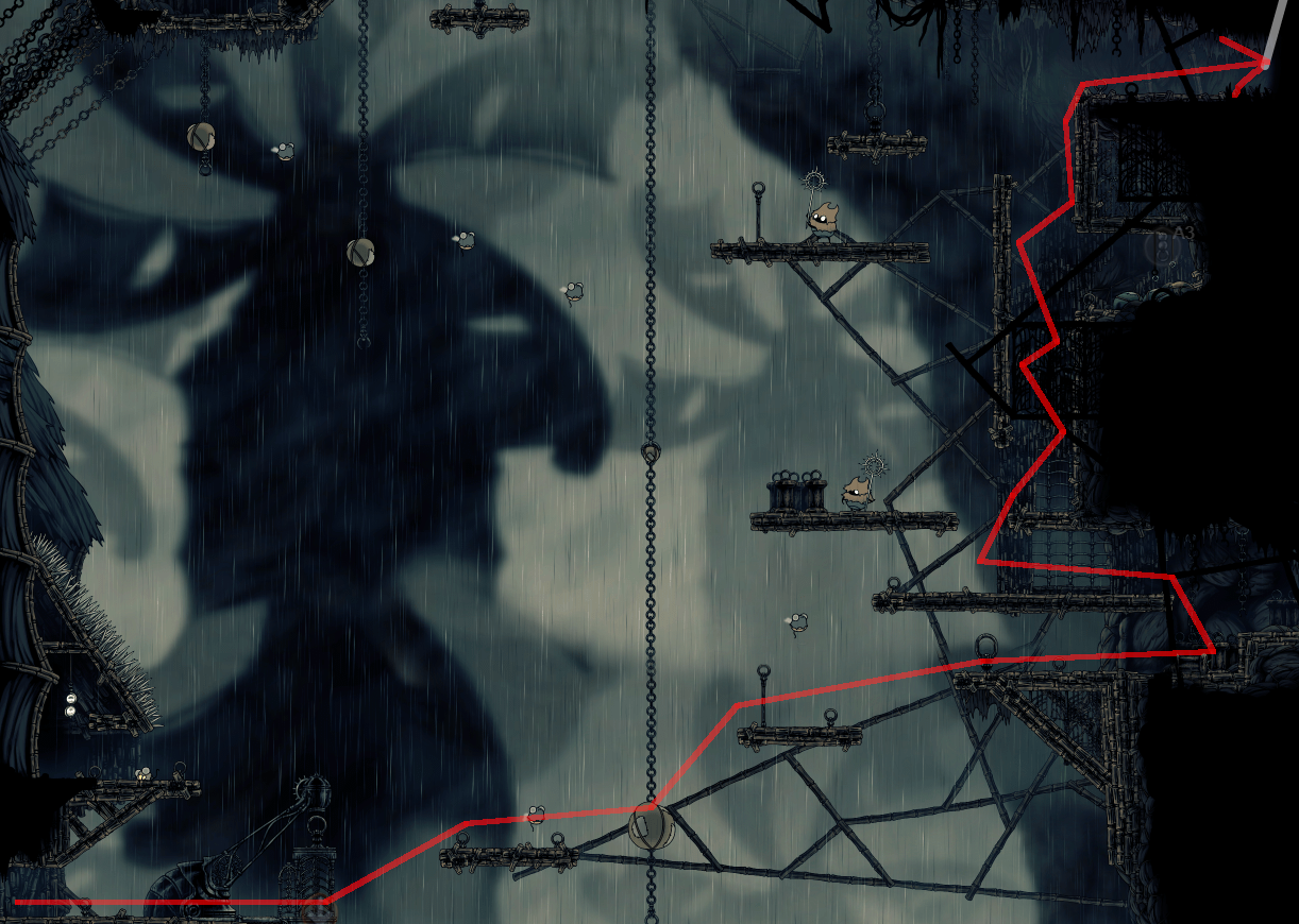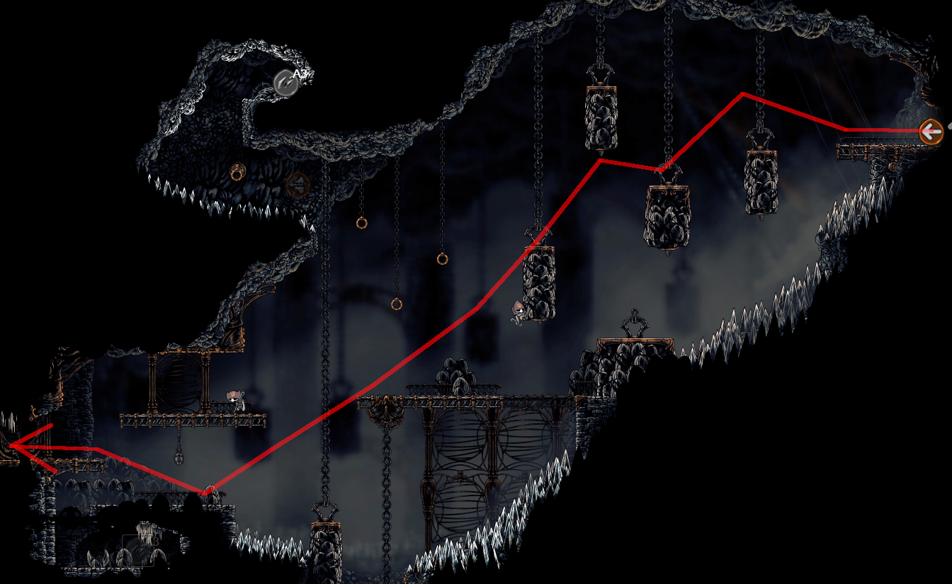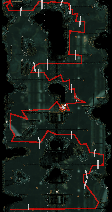 Here comes a big piece(here’s a version using Hunter). Enter the main room and hook to the ring, quickly climb and hook the spikebot, then hook the cog, pogo twice and hook the right cogwall. Recover a bit then hook the left cog, pogo more and hook a further cog, keep going and float to the ring. Take your time to kill the wallbot or avoid if it’s high enough, then kill the steambot through the platform, bait the guardbot, open the door and slip under. Climb and reach the second platform, wait for the spikebot to go up and pogo on it followed by a hook to the cog with two more pogo into float. Reposition with a pogo then hook the upper cogs twice with a float, then hook the ring and proceed. Jump early and hook the left cogwall, climb, wait for the cogsaw then pogo on it and hook the left cogs, float, hook and pogo until you reach the leftmost wall, then pogo twice and leave.