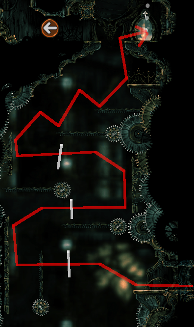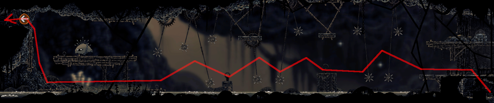 Fall down, bait the cogworker and tap it away, freefall on the right (be mindful of the wallbot) and go slightly left to avoid the cogs. Keep falling down using the cloak for safety, bait the 2 cogworkers 1 by 1 sending them to the pit, then freefall to the right again avoiding the wallbot, wait until the cogsaw goes down then float to the next platform. Get rid of the cogworker (it’s safer if you fail a jump later) then take your time until the cogsaw goes down to pogo and climb the wall left, then float to the right wall after the cogsaws pass. Wait until it goes back down and go left then climb up with a pogo on the spikes. Make use of the pogo’s range to reach the ledge above and open the door (useless) until the cogsaws come back and pogo to the next room.