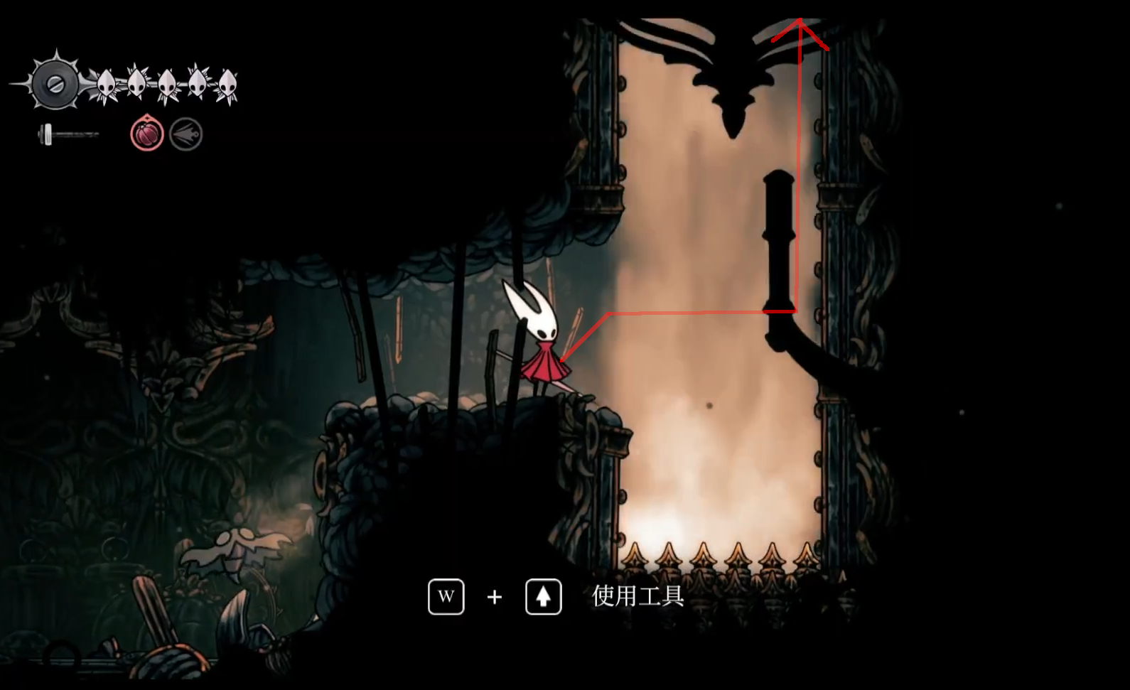 Dodge the first crawler then kill the hopbug, they are nasty and never take risks in narrow passages with those. Steal a hit on the flybug while jumping, dodge the second hopbug and pogo off the big crawler to cap silk. Avoid the third hopbug and throw a spear on the fourth one, finished with another strike, this is an annoying enemy situation otherwise. Climb up after the path opens.