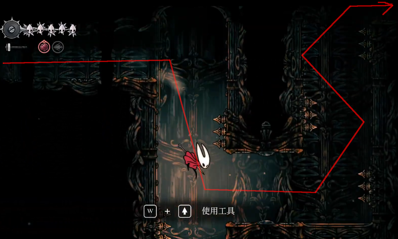 Try to hit the explosive while falling to gain some time then bounce back above the pilgrim to kill it while the explosion happens, leaving you at 7 silk. Then hit the spinebug once to reach 8 silk and finish it with a spear. To gain time use a second spear to hit the explosive from afar and wait safely until the path is open to grab the mineral. Climb up the red fruits, make sure to kill the two fly bugs because they are too erratic to take any risks. Ignore the third and enter the top room, throw a spear at mid height to hit both the rosaries string and the door.