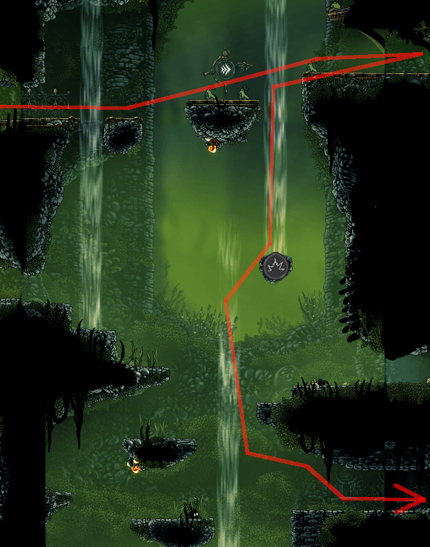 Freefall near the wall to avoid the lampbearer, then run like mad. Stop when nearing the vaultkeeper and wait until it charges to dodge above and continue. Fall down and go left, there you’ll want to wake the scrollreader and time it so you pogo on it while it lands and skip to the left room.